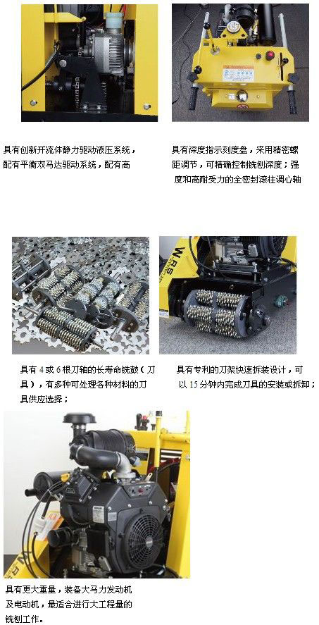 用于橋面鋪設(shè)瀝青或者舊的混凝土地面上重新攤鋪混凝土之前,清除水泥浮漿或者銑平拉毛,也可用于清除建筑施工中遺留的堅硬灰渣。